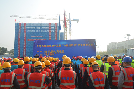 10月18日,由怀柔区住建委、建筑行业工会联合会共同主办,安博(中国)协办的怀柔区建筑业第十五届“中航建设杯”职业技能大赛,在我集团公司承建的一零一中学怀柔校区扩建项目部拉开帷幕。怀柔区住建委工程质量监督站站长单焜,区建筑业协会会长王贵军,区总工会生产生活部部长李文兴,区人力资源和社会保障局职工培训劳动鉴定中心主任刘利民,集团公司总工程师陈劲,工会主席郑春梅一同出席本次活动。