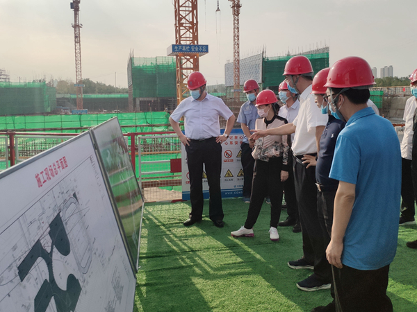 随后曾书记一行深入施工现场实地调研,当看到材料管理区域划分明确、材料码放整齐,场地作业指挥有序,工人严格按照操作规范穿戴各类防护用品,营造出一片安全文明施工的和谐氛围后,他对我集团公司的项目管理、施工管理给予高度评价。